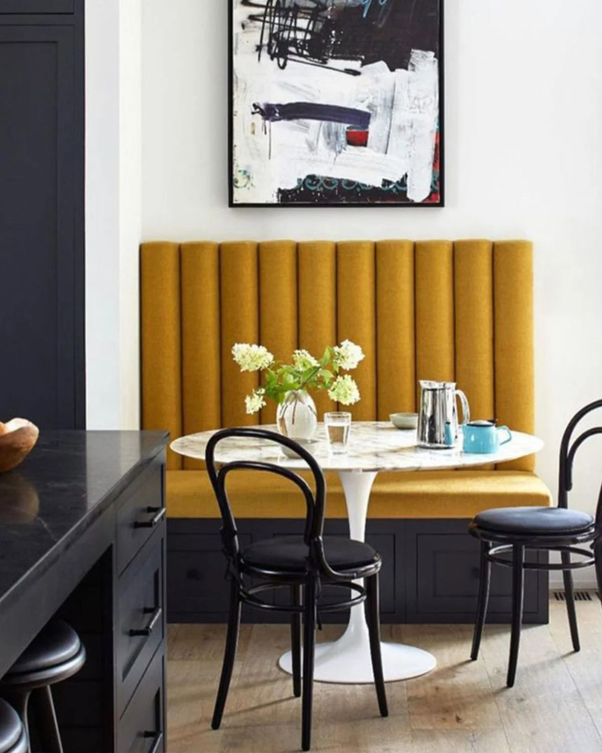 Banquette seating nods to the coveted restaurant booth feel that everyone tends to prefer over table seating. It can be hard to carve out a dining area in a narrow kitchen, but not only does it reduce the number of chairs needed, it can also double up as a homework station and place to watch TV.