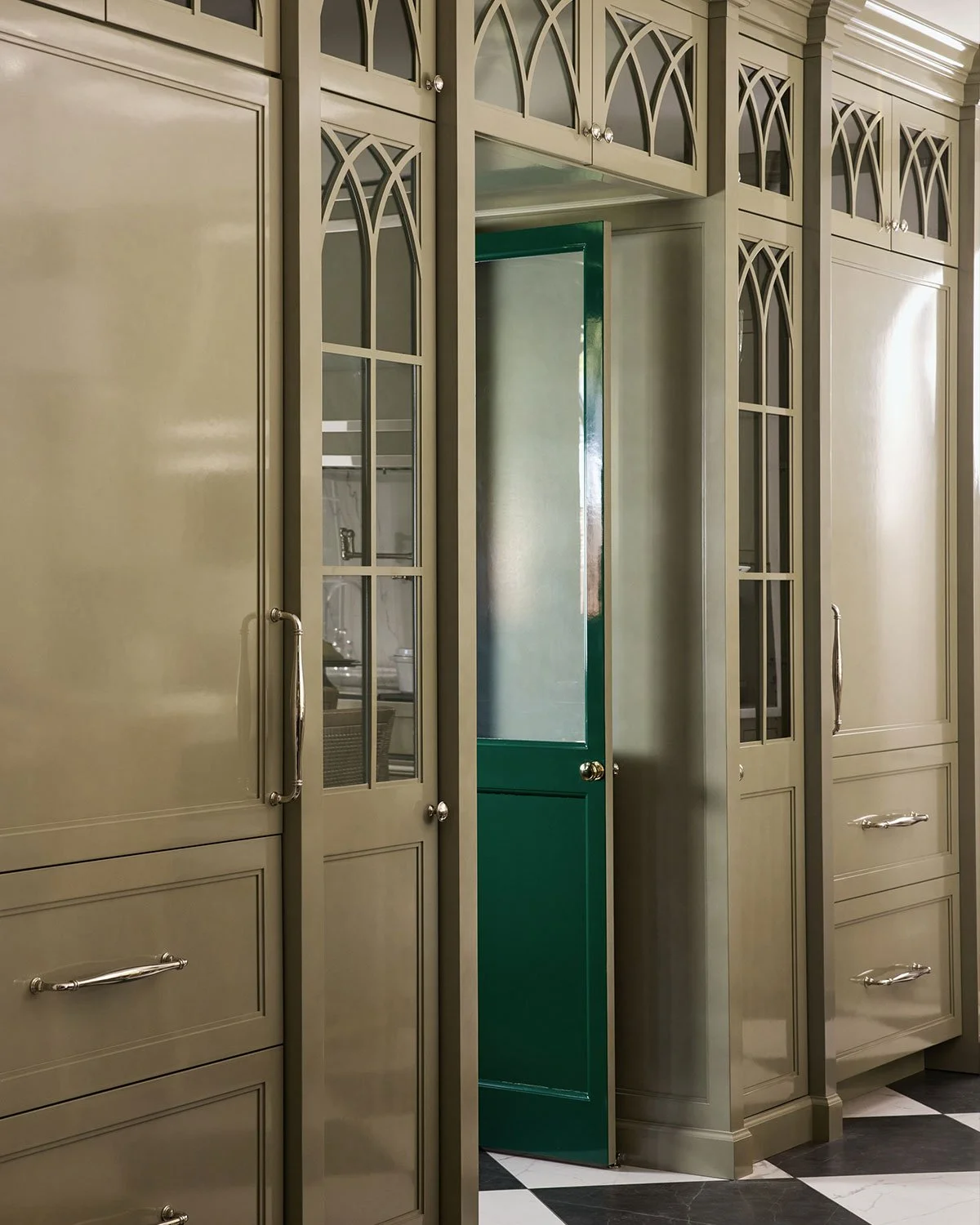 Tucked just off the main kitchen, the green room pantry is a bold study in contrast and atmosphere. Designed as a walk-in pantry concealed within a custom cabinetry wall, this space redefines utility with a rich, moody charm. We selected a deep hunter green in an ultra-gloss finish, enveloping both cabinetry and walls to create a jewel-box effect that is equal parts dramatic and cozy.