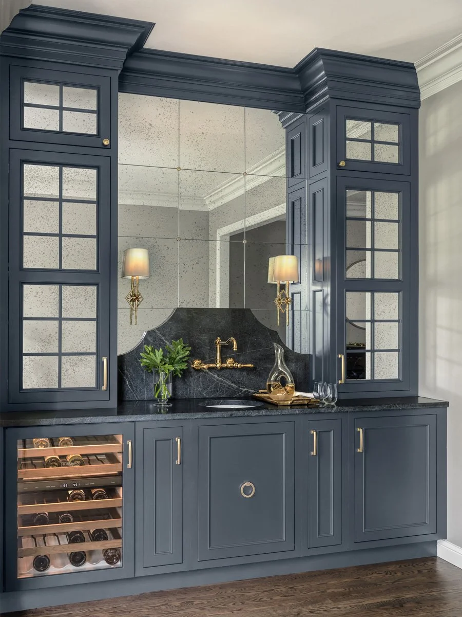 For the bar, matte blue cabinetry creates a sophisticated and moody ambiance. Brass fixtures and an antique mirror backsplash with matching mullions in flanking cabinets add vintage elegance. Ample cabinetry provides beautiful storage for spirits and glassware. The custom-designed soapstone backsplash seamlessly integrates a Rohl faucet. This striking, inviting bar space balances classic charm with contemporary style.