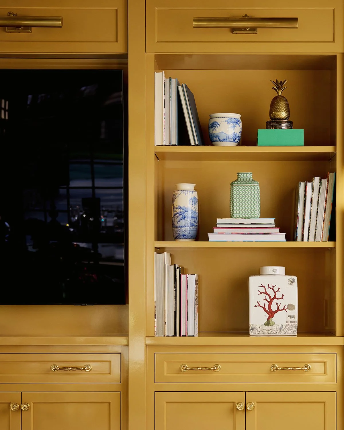 Across the room, a second golden yellow creation echoes the armoire’s playful energy, but this time it’s all about cozy. Framing a large TV and wrapped in the same high-gloss sunshine hue, this built-in transforms movie night into a golden-hour ritual. Open shelves rotate with seasonal decor, like a curated gallery of celebrations, while the closed cabinetry keeps all the electronic clutter tucked quietly out of sight. It’s a love letter to intentional living, where beauty and practicality hold hands.